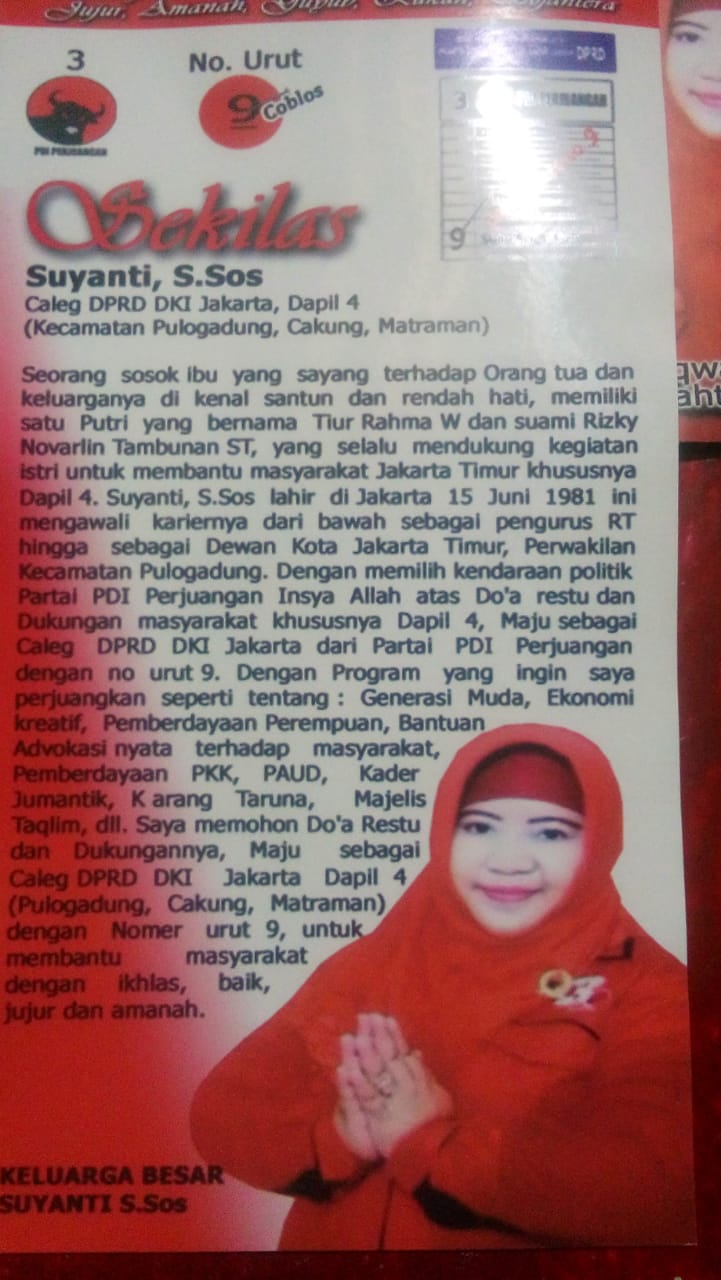 Suyanti S. Sos yang didukung warga Jakarta Timur untuk maju menjadi Calon DPRD Provinsi DKI Jakarta ini dan masyarakat sangat ingin dia duduk menjadi Wakil Rakyat dan menurut beberapa warga Jakarta Timur yang diminta konfirmasinya mengatakan bahwa Suyanti agar dapat melanjutkan program Presiden Republik Indonesia Ir. H. Joko Widodo di berbagai bidang khususnya Pendidkan dan Kesehatan dalam meningkatkan Sumber Daya Manusia (SDM) khususnya warga Jarkarta Timur. Sehubungan dengan itu juga Meli dan Endang warga Jakarta Timur berharap ibu Suyanti S. Sos memperjuangkan semua peranan wanita, hingga semua program dan visi misinya nanti, ujar warga itu memohon.