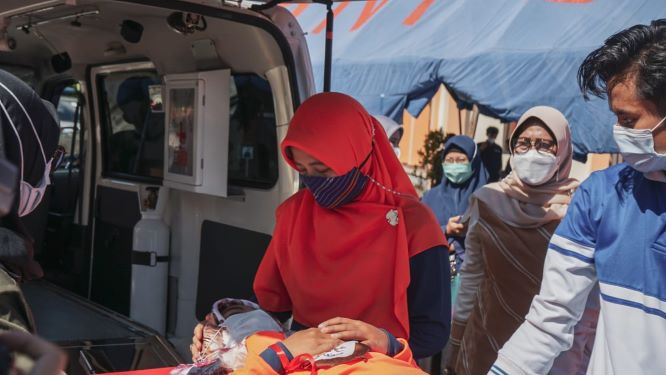 Di area pertolongan, kelompok kedua yang mendampingi petugas medis dan tenaga lapangan BPBD mulai mengidentifikasi korban. Korban luka ringan langsung diobati dan korban luka parah dibawa ke rumah sakit. Beberapa ambulan dari kabupaten/ kota juga dilibatkan dalam simulasi dan mulai mengangkut korban. Dalam simulasi tersebut, tergambar kecekatan dan keterampilan para Wanita Tangguh Bencana dalam menangani korban yang dilakukan dalam situasi mendekati peristiwa sebenarnya bahkan dalam detail mengatur lalu lintas ambulan dalam kondisi darurat. (Hendra Kususmawati)