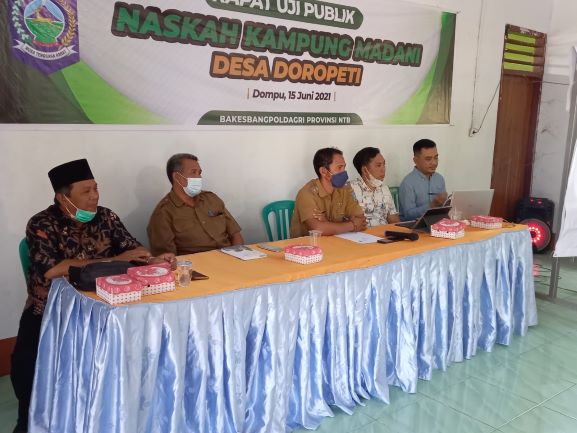 Rancangan naskah awal diserahkan langsung oleh Kepala Desa Doropeti, Dahlan, S.Pt. kepada tim kerja dari Badan Kesatuan Bangsa dan Politik Dalam Negeri (Bakesbangpoldagri) Provinsi NTB yang turun ke Dompu dipimpin langsung oleh Kepala Bidang Ketahanan Ekososbud, Agama, dan Ormas, Supri Karyadi, S.IP.