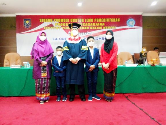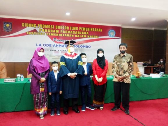 Jakarta, aspirasipublik.com – Pada hari ini Senin, tanggal 28 juni 2021 bertempat di Kampus IPDN Cilandak Jakarta selatan Dr. Drs. La Ode Ahmad P. Bolombo AP., M.Si. Secara resmi berhak menyandang gelar Doktor Ilmu Pemerintahan Ke 142. Ujian Promosi yang dilakukan selama 3 jam dari jam 09.30 sampai jam 12.30, Dipimpin oleh Bapak Rektor IPDN Dr. Hadi Prabowo, MM. Dengan tetap melakukan protokol kesehatan 3M yaitu memakai masker, mencuci tangan dan menjaga jarak, Promotor dan penguji ada yang hadir langsung dan melalui daring.