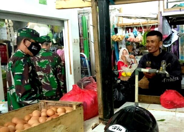 Terhadap masyarakat yang sehari – harinya beraktivitas sebagai pedagang maupun pengunjung pasar raya nanggung, selain itu Peltu Darman serta Serka Tatang Tosin sambil membagikan masker kepada masyarakat yang masih belum taat pada aturan. (Surya)
