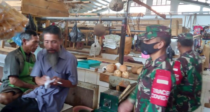Dikarenakan masih banyak pengunjung maupun pedagang di area pasar nanggung, kabupaten bogor yang masih mengabaikan protokol Kesehatan, untuk mengatasi hal tersebut anggota koramil 0621-17 nanggung dalam tugasnya untuk memantau pasar selalu membagikan masker serta melakukan sosialisasi dengan tujuan untuk antisipasi covid 19. (Surya)