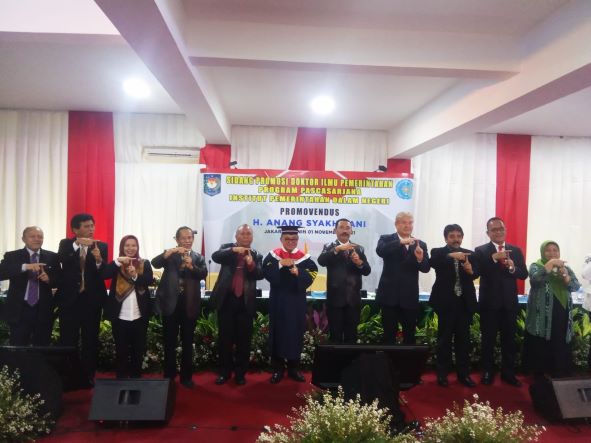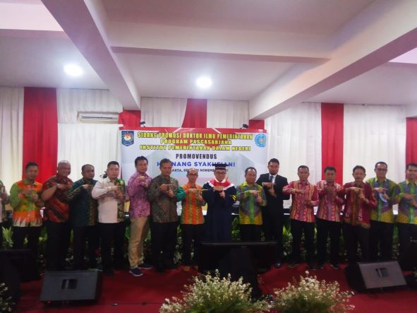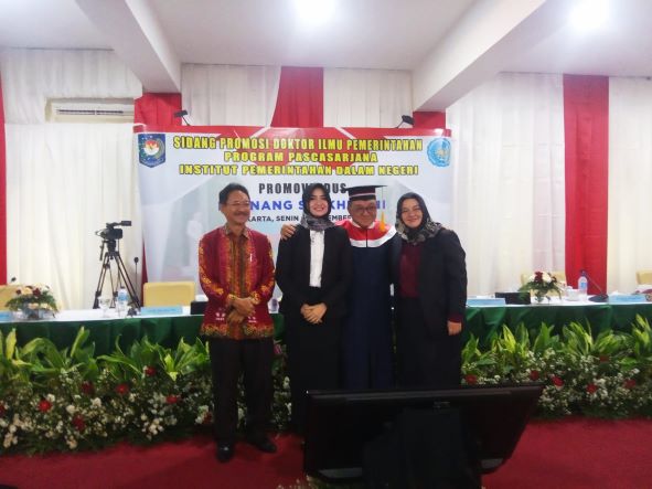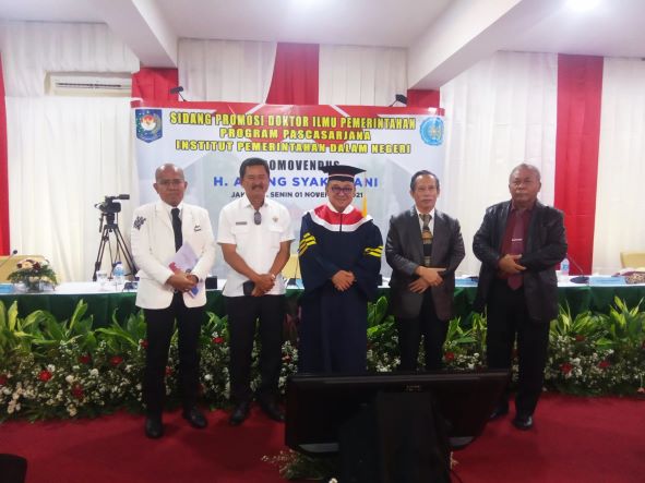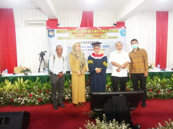 Tim Promotor yang terdiri atas: Prof. Dr. Drs. H. Khasan Effendy, M.Pd., Dr. Sampara Lukman, MA.,Dr. Marja Sinurat, M.Pd. MM. Penguji/Oponen Ahli yang terdiri atas: Dr. Hadi Prabowo, MM. (Rektot IPDN memimpin jalannya sidang)., Prof. Dr. H. Wirman Syafri, M.Si., Prof. Dr. Murtir Jeddawi, SH., M.Si., Prof. Dr. Muh. Ilham, M.Si. (Wakil Direktur Pasca Sarjana)., Dr. Mansyur Achmad, M.Si. (Kaprodi Pasca sarjana)., Dr. Dadang Suwanda, MM., Mak., Ak., CA., Dr. Faria Ruhana, MP., Dr. Ir. Dedeh Maryani, MM.,
