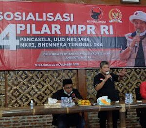 Sukabumi, aspirasipublik.com – Anggota DPR RI Partai PDI-P Ribka Tjiptaning menggelar sosialisasi empat pilar kebangsaan (Pancasila, UUD 1945, NKRI, dan Bhineka Tunggal Ika) berkerja sama dengan KONI Kabupaten Sukabumi di Cisaat, Kota Sukabumi. Pada Senin (22/11/2021).