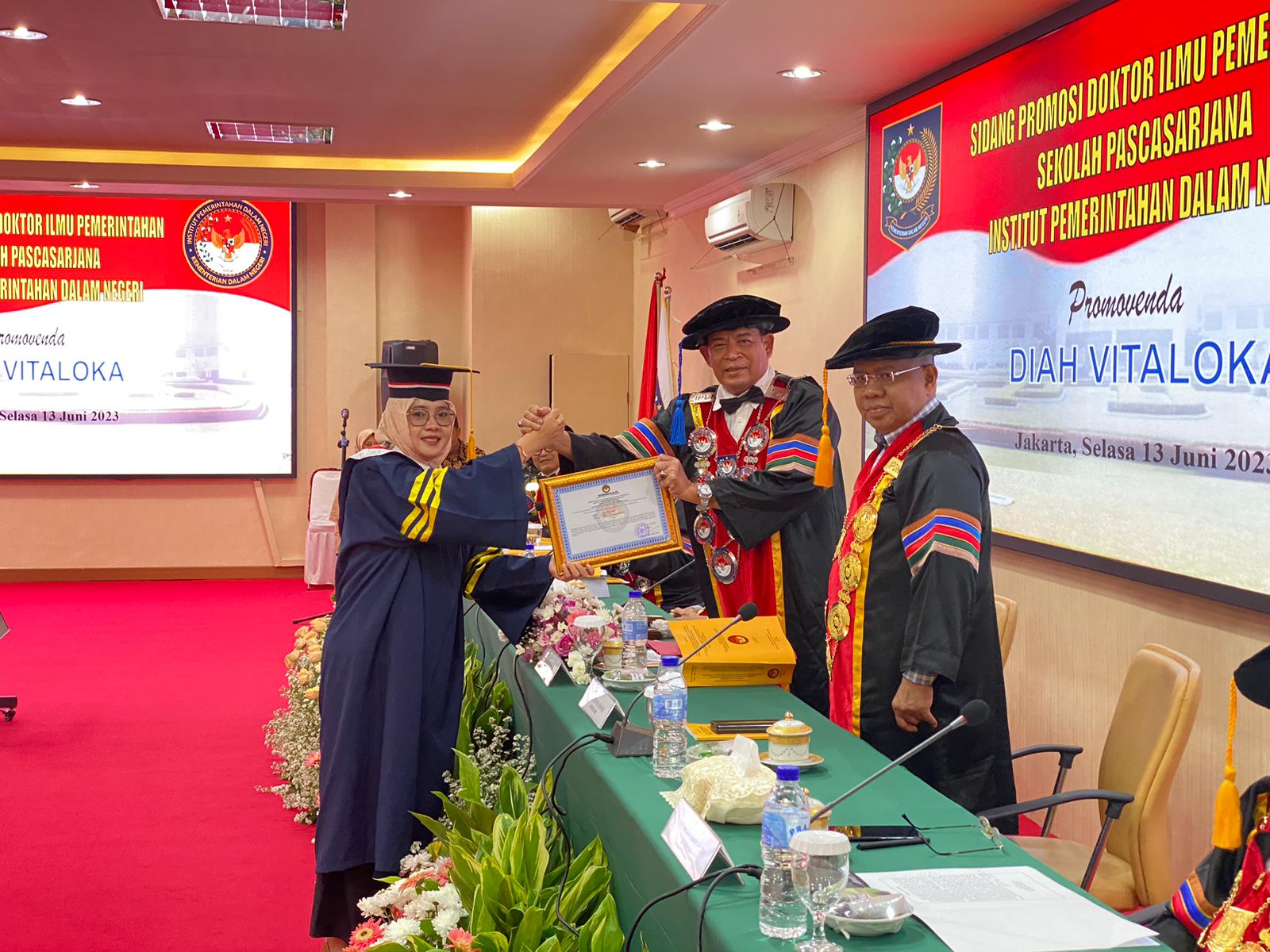 Jakarta, aspirasipublik.com – Selasa, 13 Juni 2023 berlangsung dari pukul 09.00 dan selesai pukul 12.00 di Ruang sidang khusus untuk program pasca sarjana Doktoral di lantai satu gedung pasca sarjana, Wakil Rektor II Bidang Administrasi Bapak Dr. Drs. Rizari, MBA., M.Si. mewakili atas nama Rektor IPDN Bapak Dr. Drs. Hadi Prabowo, MM. dan pada siang ini diputuskan hasil sidang promosi Doktor bahwasanya atas nama Kanjeng Pangeran Dr. Diah Vitaloka, S.IP., MM., Komisaris PT Jamkrida Babel (Perseroda) dan menjadi Direktris CV. Amda Prima Bangka, Setelah mempertahankan Disertasinya dihadapan promotor dan penguji selama tiga jam akhirnya dapat Meraih gelar Doktor Ilmu Pemerintahan ke 206 dengan predikat Sangat Memuaskan.dengan judul Disertasi: “Pengaruh Kapasitas Kelembagaan dan Komunikasi Terhadap Kinerja Dewan Perwakilan Rakyat Daerah Provinsi Kepulauan Bangka Belitung”.
