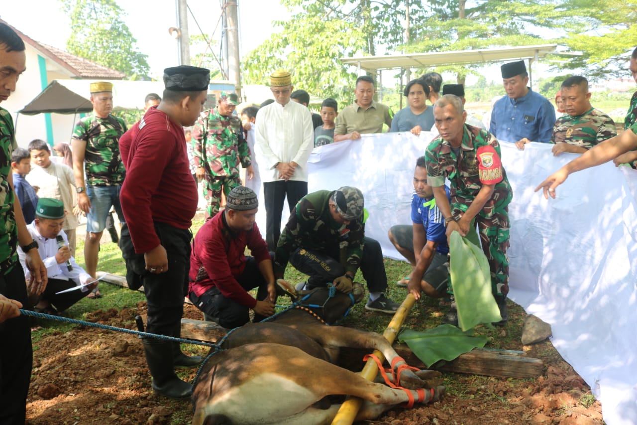 Selanjutnya penyerahan hewan Qurban secara simbolis oleh Komandan Korem 052/Wkr Kepada Panitia dilanjutkan dengan penyembelihan hewan Kurban dan penyaluran kepada warga sekitar.