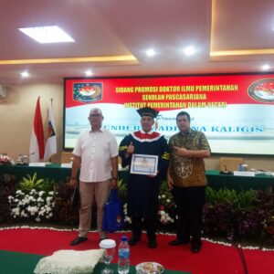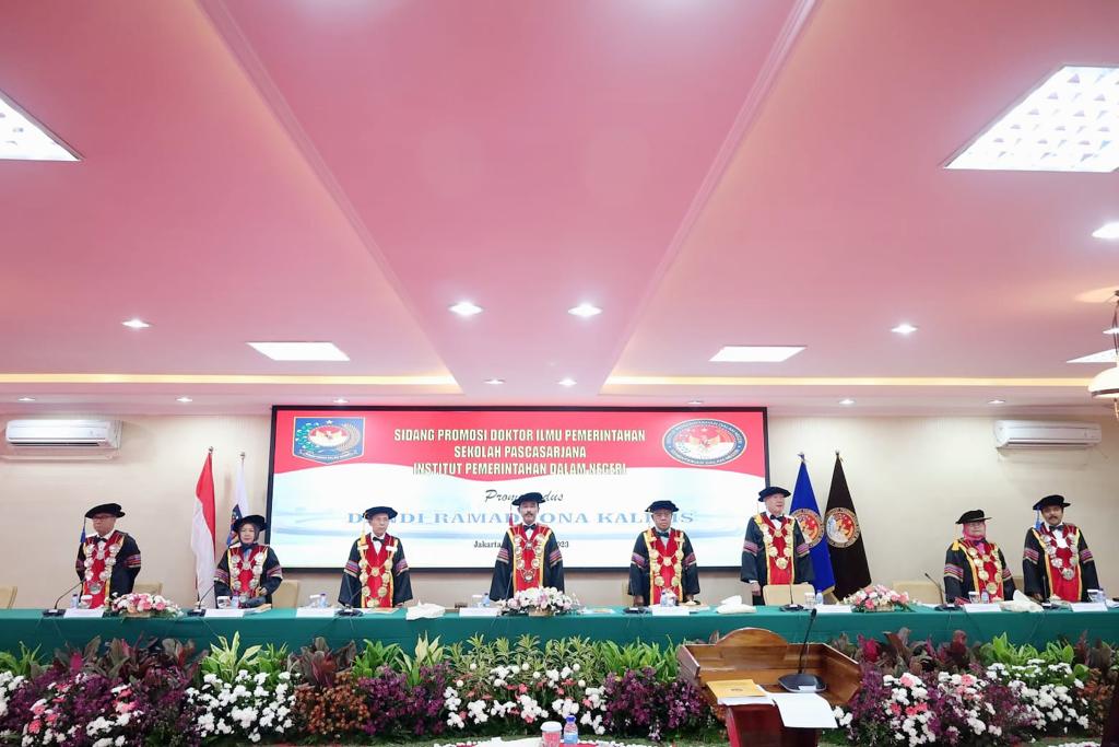 Jakarta, aspirasipublik.com – Rabu , 12 Juli 2023, berlangsung dari pukul 13.00 dan selesai pukul 15.45 di Ruang sidang program pasca sarjana Doktoral IPDN di lantai satu gedung pasca sarjana Institut Pemerintahan Dalam Negeri jakarta , Rektor IPDN Bapak Dr. Drs. Hadi Prabowo, MM., Memimpin secara langsung jalannya sidang terbuka dan selain menjadi ketua sidang juga sekaligus mewakili Bapak Menteri Dalam Negri Menteri (Mendagri) RI Jenderal Polisi (Purn) Prof. Drs. H. Muhammad Tito Karnavian, M. A., Ph. D. dalam undangan pada acara Sidang Promosi Doktor Ilmu Pemerintahan Sekolah Pascasarjana IPDN. Hasil sidang promosi Pada sore ini pukul 16.00 Wib diputuskan bahwasanya atas nama Dr.H. Dendi Ramadhona Kaligis, S.T., M.Tr.I.P . Bupati Pesawaran Provinsi Lampung Putra dari Bpk. Zulkifli Anwar Komisi II DPR RI. Setelah mempertahankan Disertasinya dihadapan promotor dan penguji selama tiga jam akhirnya Berhak dan dapat Meraih gelar Doktor Ilmu Pemerintahan ke 221 dengan predikat sangat Memuaskan, dengan judul Disertasi