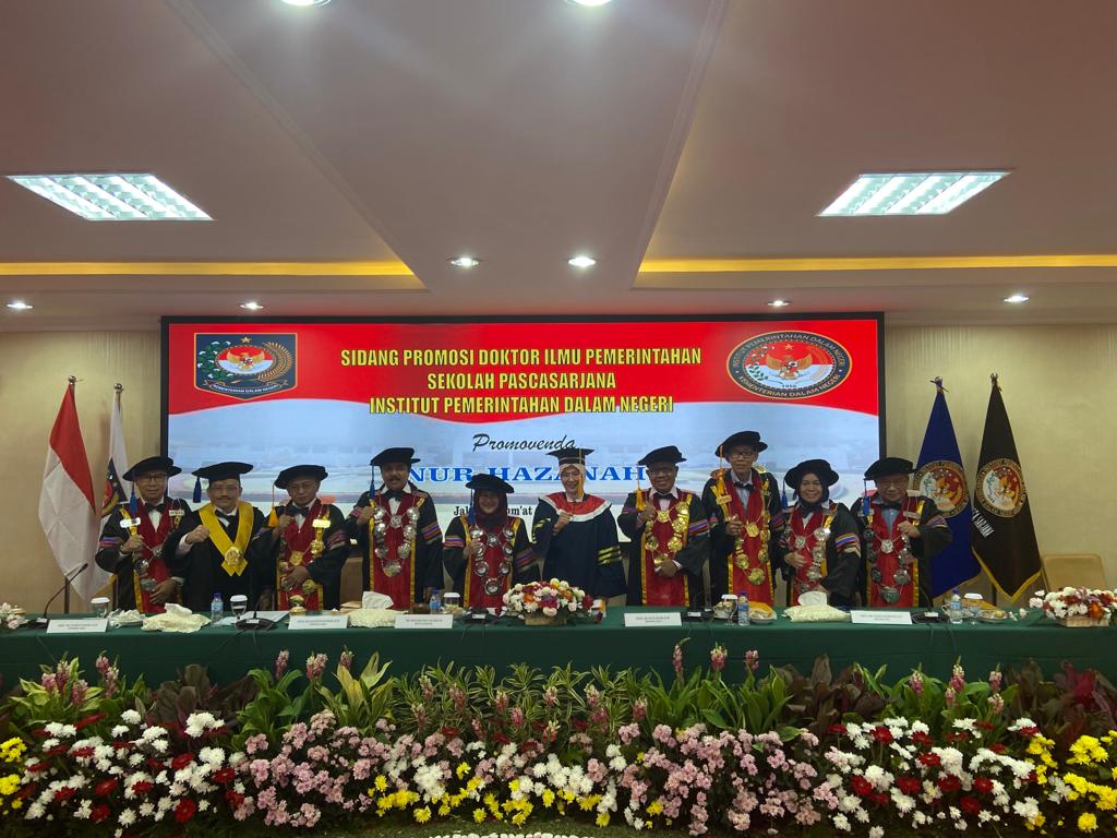 Jakarta, aspirasipublik.com – Jumat, 14 Juli 2023, berlangsung dari pukul 09.00 dan selesai pukul 11.30 di Ruang sidang program pasca sarjana Doktoral IPDN di lantai satu gedung pasca sarjana Institut Pemerintahan Dalam Negeri jakarta, Ibu Dr. Deti Mulyati., SH., MH., CN. Wakil Rektor Bidang Kerjasama mewakili atas nama Rektor IPDN Bapak Dr. Drs. Hadi Prabowo, MM. sore ini memutuskan hasil sidang promosi Doktor bahwasanya atas nama Ibu Dr. Nur Hazanah,S.STP.,M.Tr.I.P. Kepala Bidang Pengembangan Jasa Kontruksi pada Dinas Pekerjaan Umum dan Tata Ruang Pemerintah Daerah Kabupaten Bandung Jawa Barat, Setelah mempertahankan Disertasinya dihadapan promotor dan penguji selama tiga jam akhirnya Berhak dan dapat Meraih gelar Doktor Ilmu Pemerintahan ke 224 dengan predikat sangat Memuaskan ,dengan judul Disertasi