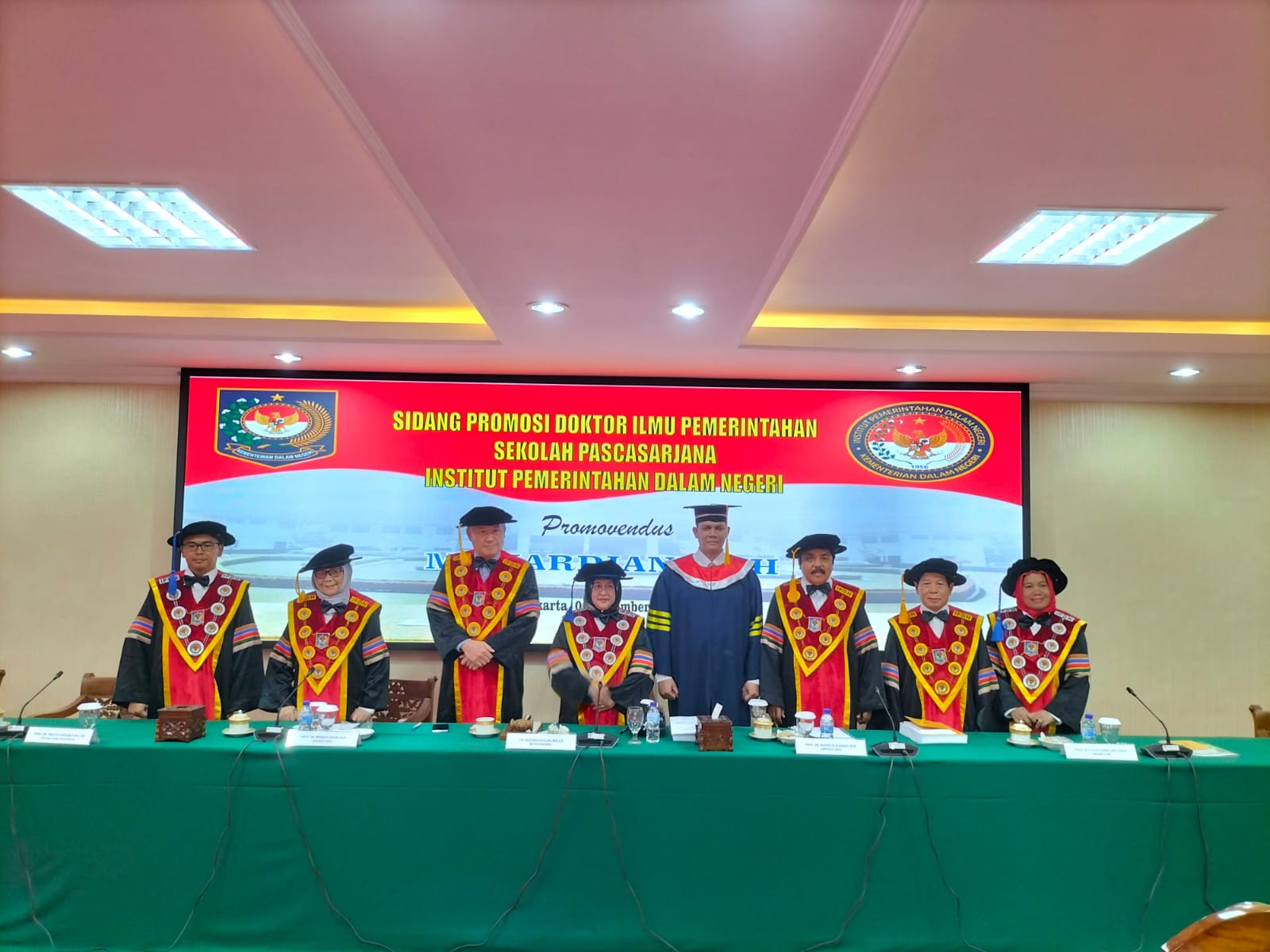 Dengan Tim Promotor yang terdiri dari :1 Prof. Muchlis Hamdi, MPA., Ph.D (Ketua Promotor )., 2. Dr. Yudi Rusfiana, S.IP, M.Si ( Wakil Rektor III selaku Co Promotor 1)., 3.Dr. Ika Sartika, MT.(Wakil Direktur Pasca sarjana sebagai Co Promotor 2 )., Tim Penguji/Oponen Ahli yang terdiri atas:1. Prof. Dr. Drs. H. Hadi Prabowo, MM. Rektor IPDN yang dalam hal ini diwakili oleh Wakil Rektor IV Bidang Akademik dan Inovasi Ibu Dr. Deti Mulyati, SH., MH., CN. sekaligus menjadi pimpinan sidang., 2. Prof. Dr. Muh. Ilham, M.Si. (Direktur Sekolah Pasca SarjanaIPDN), 3. Prof. Dr. Wirman Syafri, M.Si., (Sekertaris Senat IPDN)., 4. Prof. Dr. Mansyur Ahmad, M.Si (Kap Prodi Sekolah Program Pasca Sarjana IPDN)., 5. Sutiyo, S.STP., M.Si., Ph.D. (Dosen IPDN)., 6. Prof. Dr. Triyuni Soemartono, MM (Penguji Eksternal).