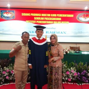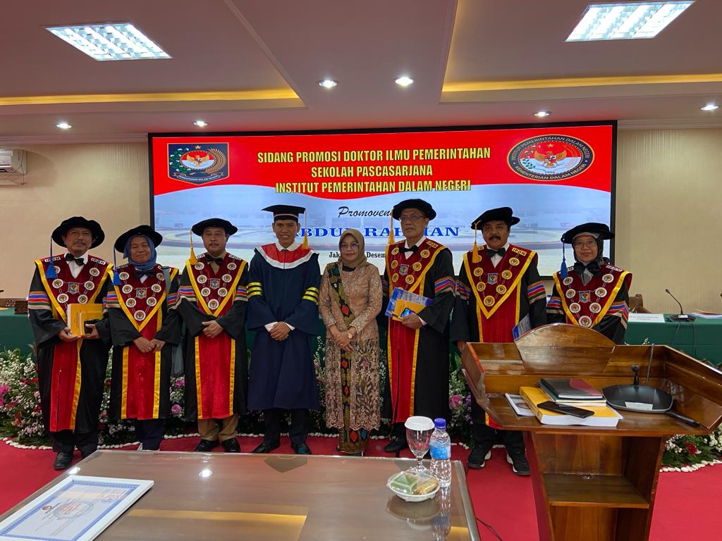 Jakarta, aspirasipublik.com – Senin 11 Desember 2023, berlangsung dari pukul 09.00 dan selesai pukul 12.00 di Ruang sidang khusus untuk program Sekolah pasca sarjana Doktoral IPDN Jakarta, Wakil Rektor I Bidang Akademik dan Inovasi Prof. Dr. Hyronimus Rowa, M.Si. mewakili atas nama Bapak Rektor IPDN Prof Dr. Drs.H. Hadi Prabowo, MM. siang ini diputuskan hasil sidang promosi Doktor atas nama Abdul Rahman, S.Pd., M.Pd., M.AP. berhak menyandang gekar Doktor Ilmu Pemerintahan IPDN didepan namanya, Dr. Abdul Rahman, S.Pd., M.Pd., M.AP., Berikut adalah Tim Promotor yang terdiri atas:1.Prof. Dr. Murtir Jeddawi, S.H., S. Sos, M.Si.,2.Prof. Dr. Masyur Achmad, M.Si.,3.Dr. Layla Kurniawati, M.Pd., Tim Penguji/Penelaah yang terdiri atas:1. Prof. Dr. Drs. H. Hadi Prabowo, MM. Rektor IPDN yang dalam hal ini siwakili oleh Wakil Rektor I Bidang Akademik dan Inovasi Prof. Dr. Hyronimus Rowa, M.Si. sekaligus menjadi pimpinan sidang dan penguji., 2. Prof. Dr. Muh. Ilham, M.Si., 3. Prof. Dr. Muhammad Mulyadi, AP., M.Si., 4. Dr. Sampara Lukman, M.A., 5. Dr. Ika Sartika, MT.,6. Dr. Tjahjo Suprajogo, M.Si.,