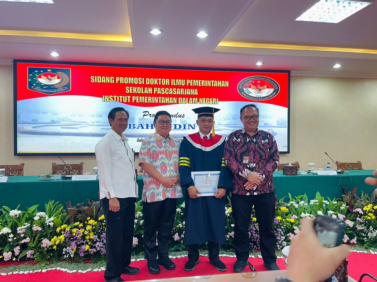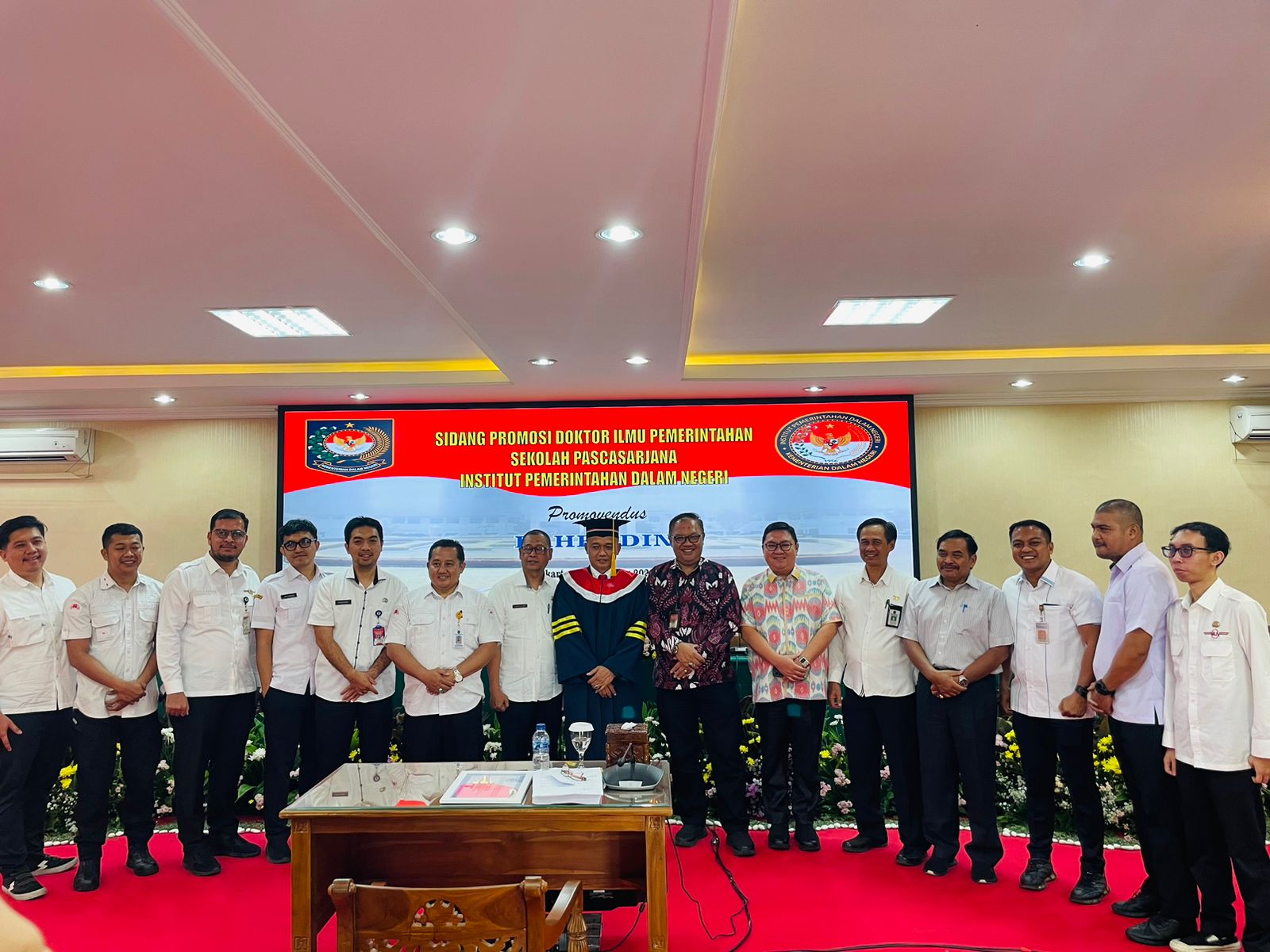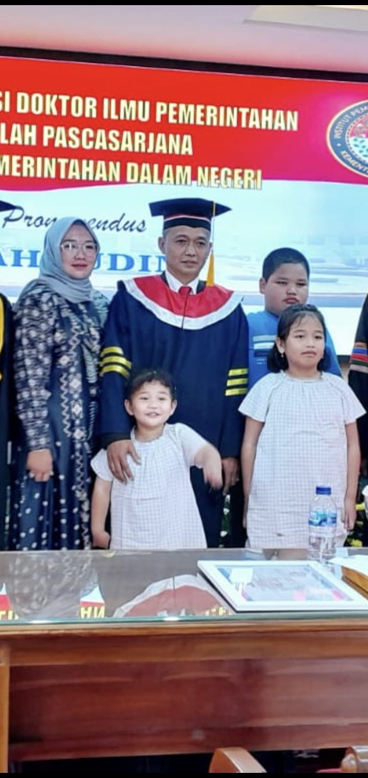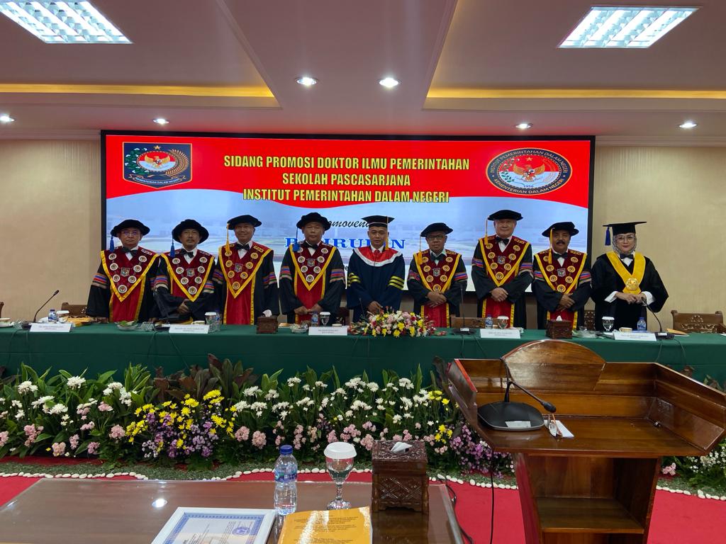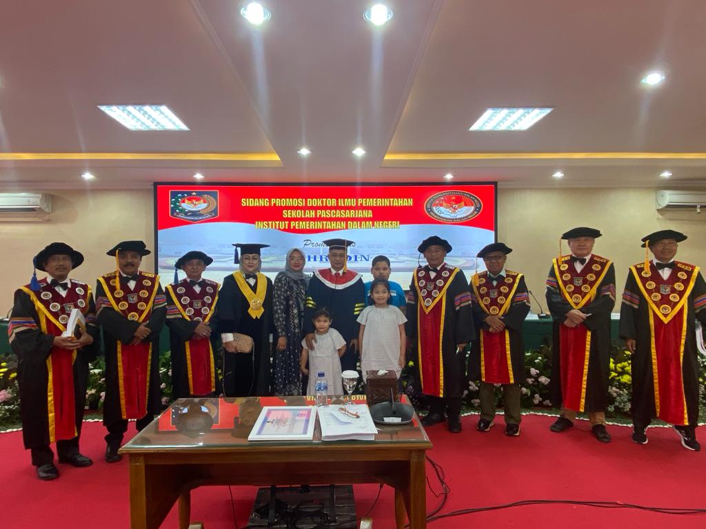 Jakarta, aspirasipublik.com – Rabu 13 Desember 2023,berlangsung dari pukul 09.00 dan selesai pukul 12.00 di Ruang sidang lantai 1 Sekolah pasca sarjana Doktoral IPDN Jakarta,Wakil Rektor III IPDN Bidang Kemahasiswaan Dr. Yudi Rusfiana, S.IP, M.Si mewakili atas nama Rektor IPDN Prof Dr. Drs.H. Hadi Prabowo, MM. siang ini diputuskan hasil sidang promosi Doktor atas nama Dr.Drs. Bahrudin,M.Si.,berhak menyandang gekar Doktor Ilmu Pemerintahan IPDN ke 248, Dengan Tim Promotor yang terdiri atas:1. Prof. Dr. Wirman Syafri, M.Si., M.Si, 2. Prof. Dr. Mansyur Achmad, M.Si.(Sek Prodi Pasca sarjana)., 3. Dr. Drs. Rizari, MBA., M.Si.,Tim Penguji/Penelaah yaitu: 1. Prof.Dr.Drs.H.Hadi Prabowo, MM. Rektor IPDN yang dalam hal ini siwakili oleh Rektor III IPDN Bidang Kemahasiswaan Dr. Yudi Rusfiana, S.IP, M.Si . sekaligus menjadi pimpinan sidang., 2. Prof. Dr. Muh. Ilham, M.Si. (Direktur Pasca sarjan)., 3. Prof. Dr. Drs. Ismail Nurdin, M.Si., 4. Prof. Dr. Dra. Ira Irawati, M.Si. (Penguji eksternal)., 5. Dr. Tjahjo Suprajogo, M.Si.,6. Dr. Mulyadi, SP., M.Si.,