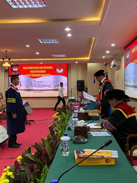 Jakarta, aspirasipublik.com – Rabu, 24 APRIL 2024, berlangsung dari pukul 09.00 dan selesai pukul 11.30 di Ruang sidang khusus untuk program pasca sarjana Doktoral IPDN Jakarta di lantai satu gedung pasca sarjana Institut Pemerintahan Dalam Negeri jakarta, Wakil Rektor II Bidang Administrasi Dr. Drs. Rizari, MBA., M.Si. mewakili atas nama Rektor IPDN Prof Dr. Drs. H. Hadi Prabowo, MM., siang ini diputuskan hasil sidang promosi Doktor Ilmu Pemerintahan IPDN bahwasanya atas nama Dr. Alek Kurniawan, SP, M.Si . Kepala Badan Pendapatan Daerah Kota Pekanbaru. Setelah mempertahankan Disertasinya dihadapan promotor dan penguji selama tiga jam akhirnya Berhak dan dapat Meraih gelar Doktor Ilmu Pemerintahan ke 265 dengan predikat Sangat Memuaskan dengan judul Disertasi: “Model Optimalisasi Pengelolaan Pajak Daerah untuk Mewujudkan Kemandirian Keuangan Daerah di Kota Pekanbaru Provinsi Riau”Dengan Tim Promotor yang terdiri dari: 1.Prof.Dr.Drs.Bahrullah Akbar, SE, MBA, CIPM, CSFA, CPA . sebagai Ketua Promotor.,2.Dr. Marja Sinurat, M.Pd, MM sebagai Co-Promotor ., 3.Dr. Meltarini, M.Si .sebagai Co-Promotor ., Tim Oponen Ahli dan PeneIaah yang terdiri atas:1.Prof. Dr.Drs. H.Hadi Prabowo, MM., Rektor IPDN yang diwakili oleh Wakil Rektor II Bidang Administrasi Bapak Dr. Drs. Rizari, MBA., M.Si..selaku pimpinan sidang sekaligus menjadi penguji .,2. Prof. Dr. Muh. Ilham, M.Si (Direktur Sekolah Pasca SarjanaIPDN).,3. Prof. Dr. Dadang Suwanda, MM., M.Ak., CA ., 4.Prof. Dr. Mahlia Muis, SE., ME (Penguji Eksternal).,5.Dr. Ani Martini, S.STP, M.Si.,