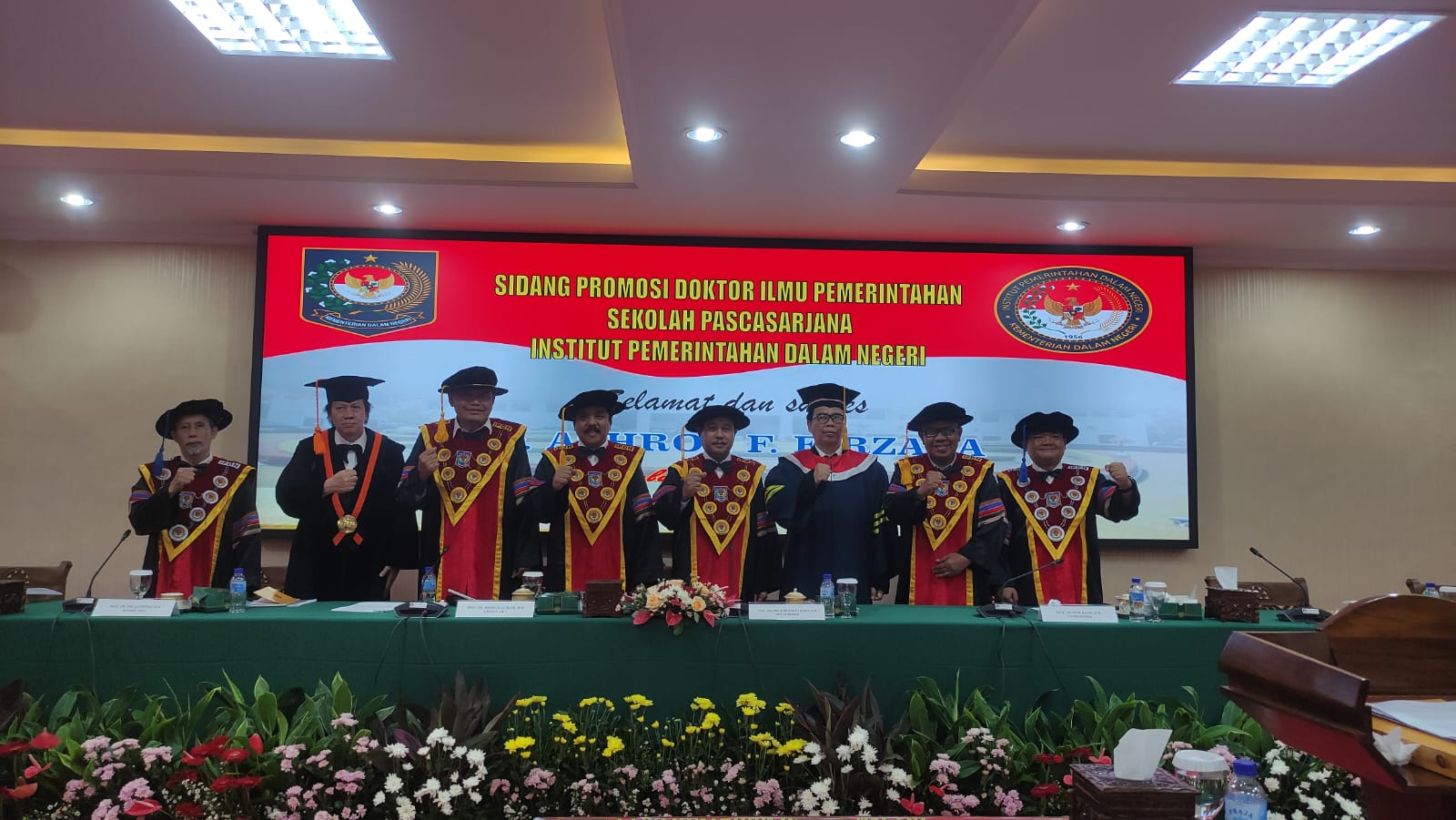 Jakarta, aspirasipublik.com – Rabu, 15 Mei 2024, berlangsung dari pukul 09.00 dan selesai pukul 12.00 di Ruang sidang khusus untuk program pasca sarjana Doktoral IPDN Jakarta di lantai satu gedung pasca sarjana Institut Pemerintahan Dalam Negeri jakarta, Wakil Rektor I Bidang Akademik dan Inovasi Prof. Dr. Hyronimus Rowa, M.Si. mewakili atas nama Rektor IPDN Bapak Prof. Dr. Drs.H. Hadi Prabowo, MM., Siang ini diputuskan hasil sidang promosi Doktor bahwasanya atas nama Dr. Drs. H. Ashrof F. Firzada Mahalli, SE., M.Si. Asisten Bidang Administrasi Umum Sekretariat Daerah Kabupaten Tangerang Provinsi Banten, setelah mempertahankan Disertasinya dihadapan promotor dan penguji selama tiga jam akhirnya Berhak dan dapat Meraih gelar Doktor Ilmu Pemerintahan ke 267 dengan predikat sangat Memuaskan dengan judul Disertasi: “PENGARUH KAPASITAS KELEMBAGAAN DAN PENGGUNAAN ANGGARAN BERBASIS KINERJA TERHADAP PENERIMAAN PENDAPATAN ASLI DAERAH KABUPATEN TANGERANG”Dengan Tim Promotor yang terdiri dari :1.Prof Dr. Drs. Bahrullah Akbar, SE, MBA, CIPM, CSFA, CPA.,Ketua Tim Promotor., 2. Prof. Dr. Muh. Ilham, M.Si., Direktur Pasca sarjana IPDN selaku Co Promotor satu dan 3. Dr. Megandaru W. Kawuryan, S.IP, M.Si., Sebagai co promotor dua.