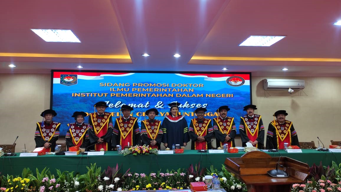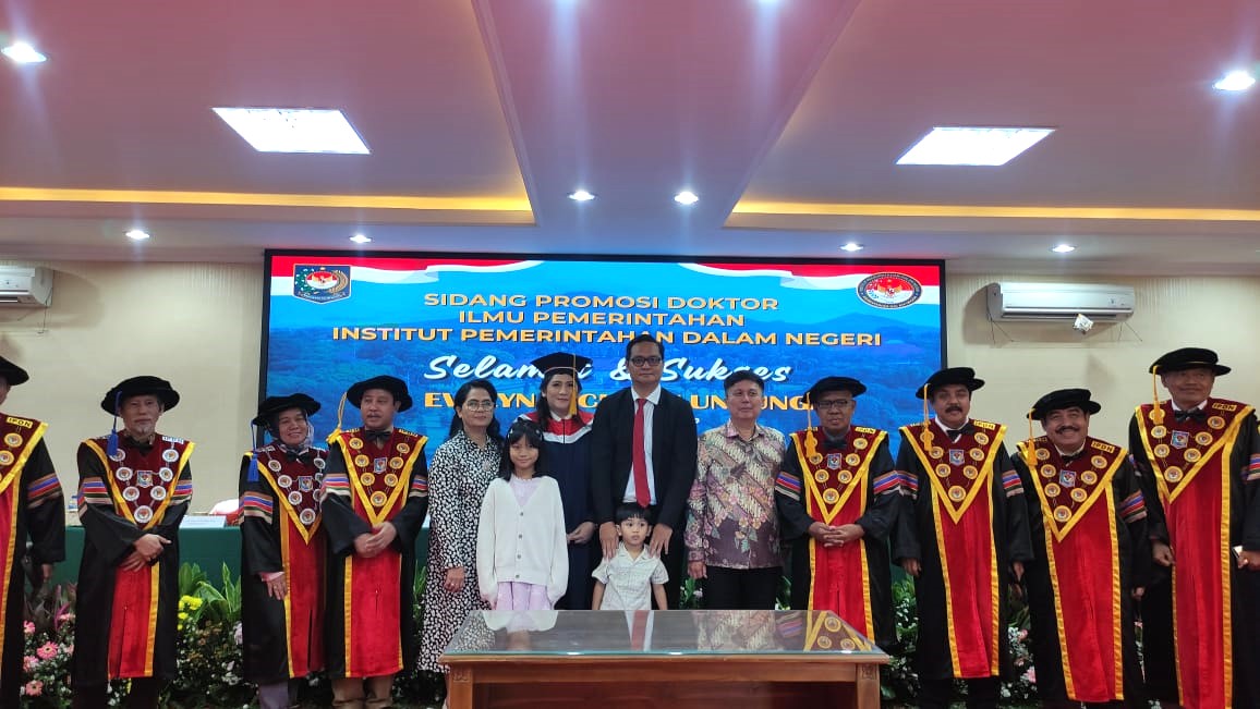 Jakarta, aspirasipublik.com – Selasa, 2 Juli 2024, berlangsung dari pukul 09.00 dan selesai pukul 12.00 di Ruang sidang khusus untuk program pasca sarjana Doktoral IPDN Jakarta di lantai satu gedung pasca sarjana Institut Pemerintahan Dalam Negeri jakarta, Wakil Rektor I Bidang Akademik dan Inovasi Prof. Dr. Hyronimus Rowa, M.Si., mewakili atas nama Rektor IPDN Bapak Prof. Dr. Drs. H. Hadi Prabowo, MM., siang ini diputuskan hasil sidang promosi Doktor bahwasanya atas nama Dr. Evelyn Cicilya Luntungan, S.IP., MAP., Sekretaris Dinas Tenaga Kerja, Koperasi dan UKM Kabupaten Minahasa Utara Provinsi Sulawesi Utara Raih Gelar Doktor Ilmu Pemerintahan IPDN KEMENDAGRI ke 282 dengan Predikat Sangat Memuaskan dengan judul Disertasi