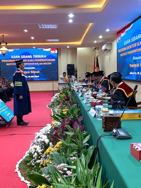 Jakarta, aspirasipublik.com.com – Rabu, 10 Juli 2024, berlangsung dari pukul 09.00 dan selesai pukul 12.00 di Ruang sidang khusus untuk program pasca sarjana Doktoral IPDN Jakarta di lantai satu gedung pasca sarjana Institut Pemerintahan Dalam Negeri jakarta, Wakil Rektor III Bidang Kewahasiswaan Bapak Dr. Yudi Rusfiana, S.IP., M.Si., mewakili atas nama Rektor IPDN Bapak Prof. Dr. Drs. H. Hadi Prabowo, MM., Siang ini diputuskan hasil sidang promosi Doktor bahwasanya atas nama Dr. Ir. Yosya Rizal, M.T., Kepala Badan Pengelolaan Keuangan dan Aset Daerah Kabupaten Pesawaran Provinsi Lampung, Resmi Berhak Meraih Gelar Doktor Ilmu Pemerintahan IPDN KEMENDAGRI ke 284 dengan Predikat Sangat Memuaskan judul Disertasi :