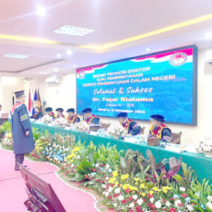 Jakarta, aspirasipublik.com – Selasa, 12 November 2024, berlangsung dari pukul 09.00 dan selesai pukul 12.00 di Ruang sidang khusus untuk program pasca sarjana Doktoral IPDN Jakarta di lantai satu gedung pasca sarjana Institut Pemerintahan Dalam Negeri jakarta , Wakil Rektor III Bidang Kewahasiswaan Bapak Dr. Yudi Rusfiana, S.IP.,M.Si. mewakili atas nama Rektor IPDN Bapak Prof. Dr. Drs. H. Hadi Prabowo, MM., Siang ini diputuskan hasil sidang promosi Doktor bahwasanya atas nama Dr. Fajar Riatama, S.STP., MM., Camat Metro Selatan Kota Metro Provinsi Lampung Raih Gelar Doktor Ilmu Pemerintahan IPDN Kemendagri yang ke 302 Dengan Predikat Sangat Memuaskan dengan judul Disertasi :