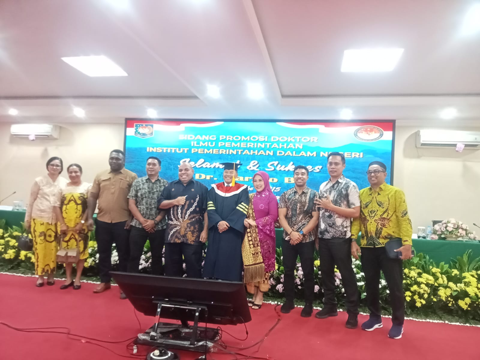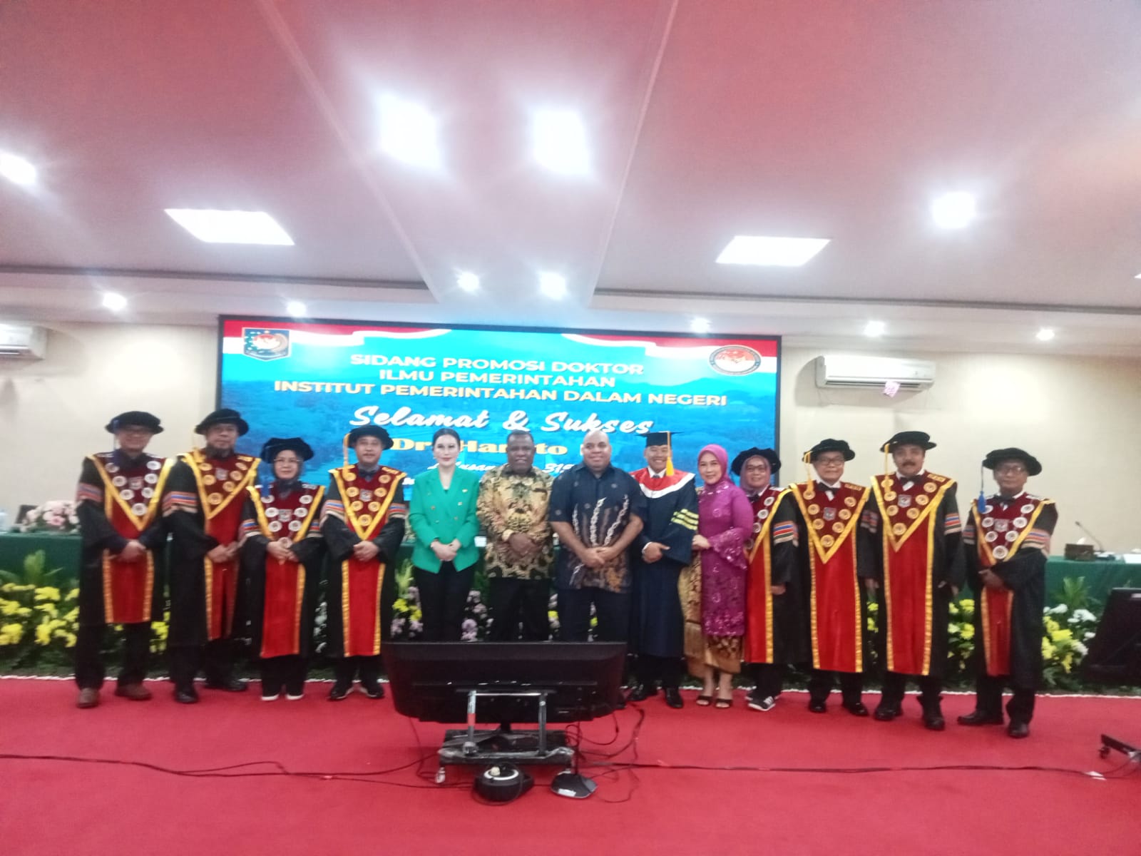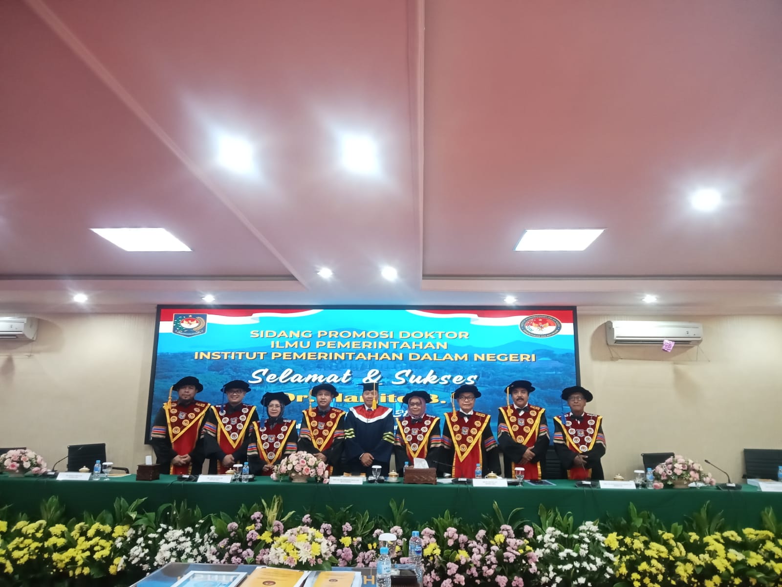 “Implementasi Kebijakan Penjabat Gubernur Dalam Penanganan Masalah Sosial Di Provinsi Papua Barat Daya” Dengan Tim Promotor yang terdiri dari :1. Prof. Dr. Djohermansyah Djohan, M.A. sebagai Ketua Promotor,. 2. Prof.Dr.MansyurAchmad, M.Si. Co-Promotor 1 dan 3. Dr. Prio Teguh, SH., M.Si., Co-Promotor 2. Dan Tim Oponen Ahli dan Penelaah yang terdiri atas: 1. Prof. Dr. Drs. H. Hadi Prabowo, MM. Rektor IPDN yang diwakili oleh Wakil Rektor 1 Bidang Akademik dan Inovasi Prof. Dr. Hyronimus Rowa, M.Si. memimpin jalannya sidang., 2. Prof. Dr. Muh. Ilham, M.Si., 3. Dr. Ika Sartika, MT., 4. Dr. Faria Ruhana, MP., 5. Dr. Ahmad Averus Toana, M.Si., 6. Prof. Dr. Mohammad Mulyadi, AP, M.Si (Oponen Ahli Eksternal)