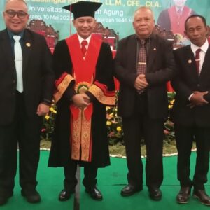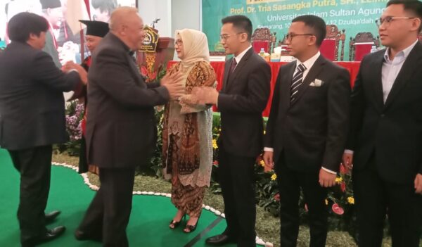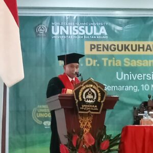 Semarang, aspirasipublik.com – Universitas Islam Sultan Agung (Unissula) Semarang mengukuhkan Prof. Dr. Tria Sasangka Putra, S.H., LL.M., CFE., CLA., sebagai Guru Besar (Profesor) pada Bidang Ilmu Hukum Bisnis, Sabtu 10 Mei 2025 Yang pelaksanaanya dipimpin langsung oleh Rektor UNISSULA Prof. Dr. Gunarto, S.H., MH., didampingi Wakil Rektor I, II, dan III, Ketua Senat, Dekan Fakultas Hukum Universitas Islam Sultan Agung dan disaksikan oleh Bapak dan Ibu Dosen dan Tenaga Kependidikan dan Civitas Academika Universitas Islam Sultan Agung serta Turut hadir Keluarga Istri dan ketiga putranya, Para Undangan, Rekan, Sahabat sahabatnya Advokat, Contract Specialist pada Badan Pengelola Industri Strategis (BPIS) – PT Industri Pesawat Terbang Nusantara (PT. IPTN), Yayasan Harapan Kita, Yayasan Indonesia Biru, Guru Besar IPDN Prof. Dr. Drs. Khasan Effendy, M.Pd. selaku Guru Besar Sosiologi Pemerintahan Institut Pemerintahan Dalam Negeri dan Tenaga Ahli Pengajar Sistem Manajemen Nasional Lemhanas Republik Indonesia dan Prof. Dr. Drs. Bahrullah Akbar, B.Sc., S.E., M.B.A., CIPM., CSFA., CPA., CMPM. selaku Guru Besar Keuangan Publik Institut Pemerintahan Dalam Negeri dan Wakil Ketua Badan Pemeriksa Keuangan Republik Indonesia periode tahun 2017 sampai dengan tahun 2019, Sahabat Alumni Doktor IPDN, Dr. Raden. Bogie Setia Perwira Nusa, S.H., S.H.I., M.H., M.Si., M.AP., dan Dr. Joko Susilo Raharjo Watimena, S.PdI., MM.