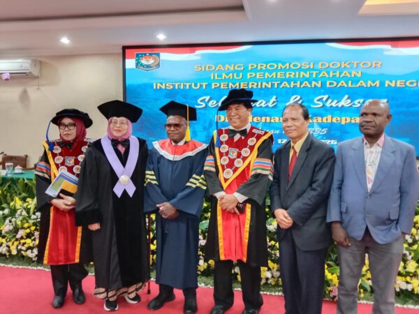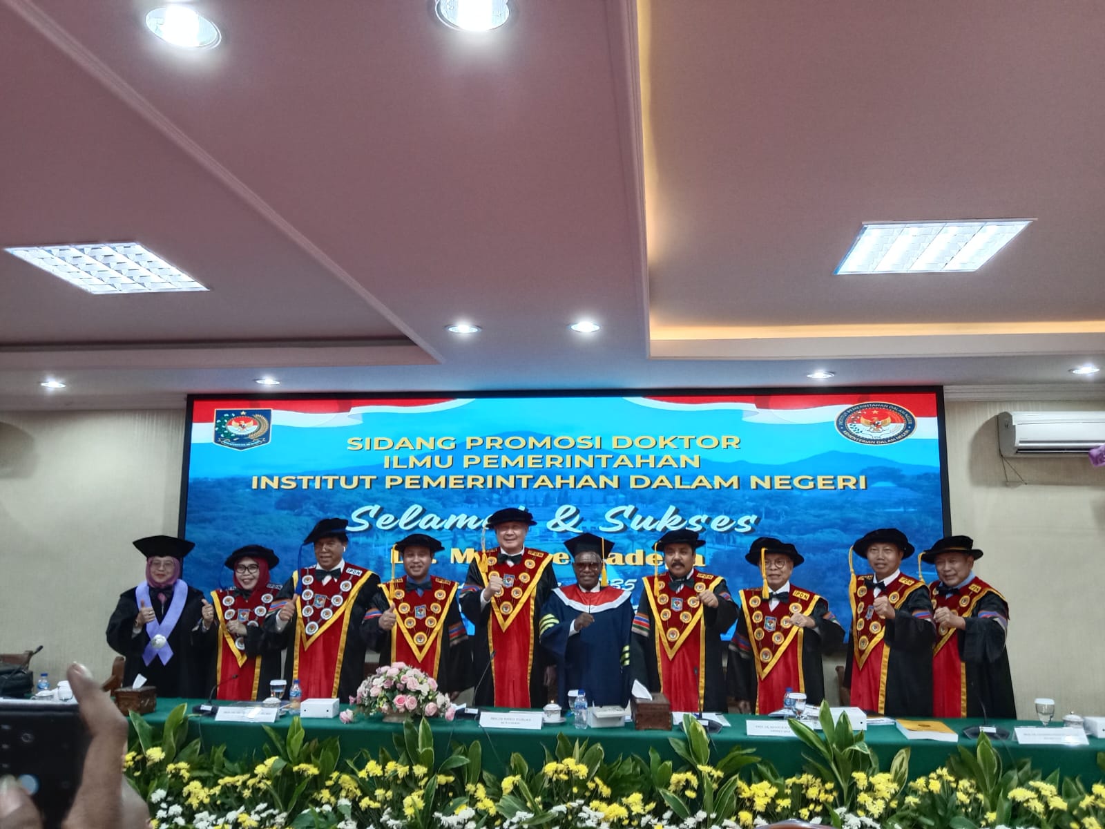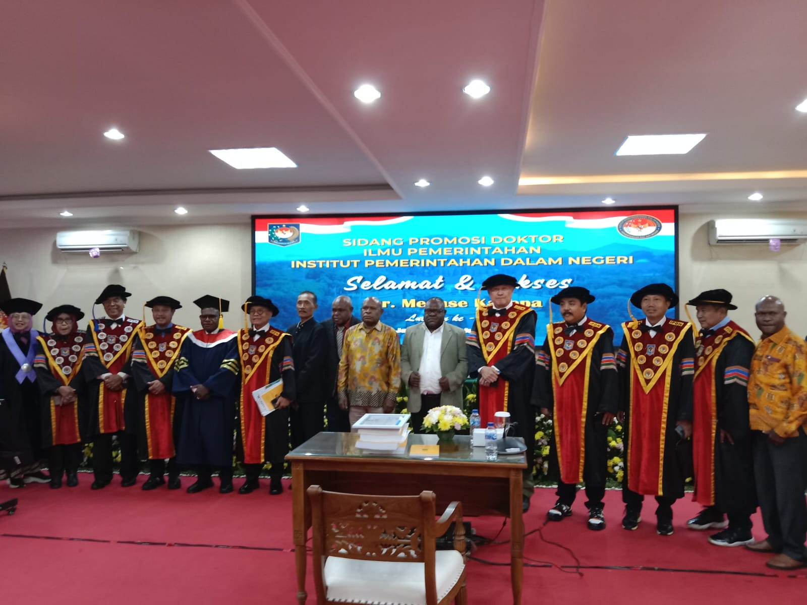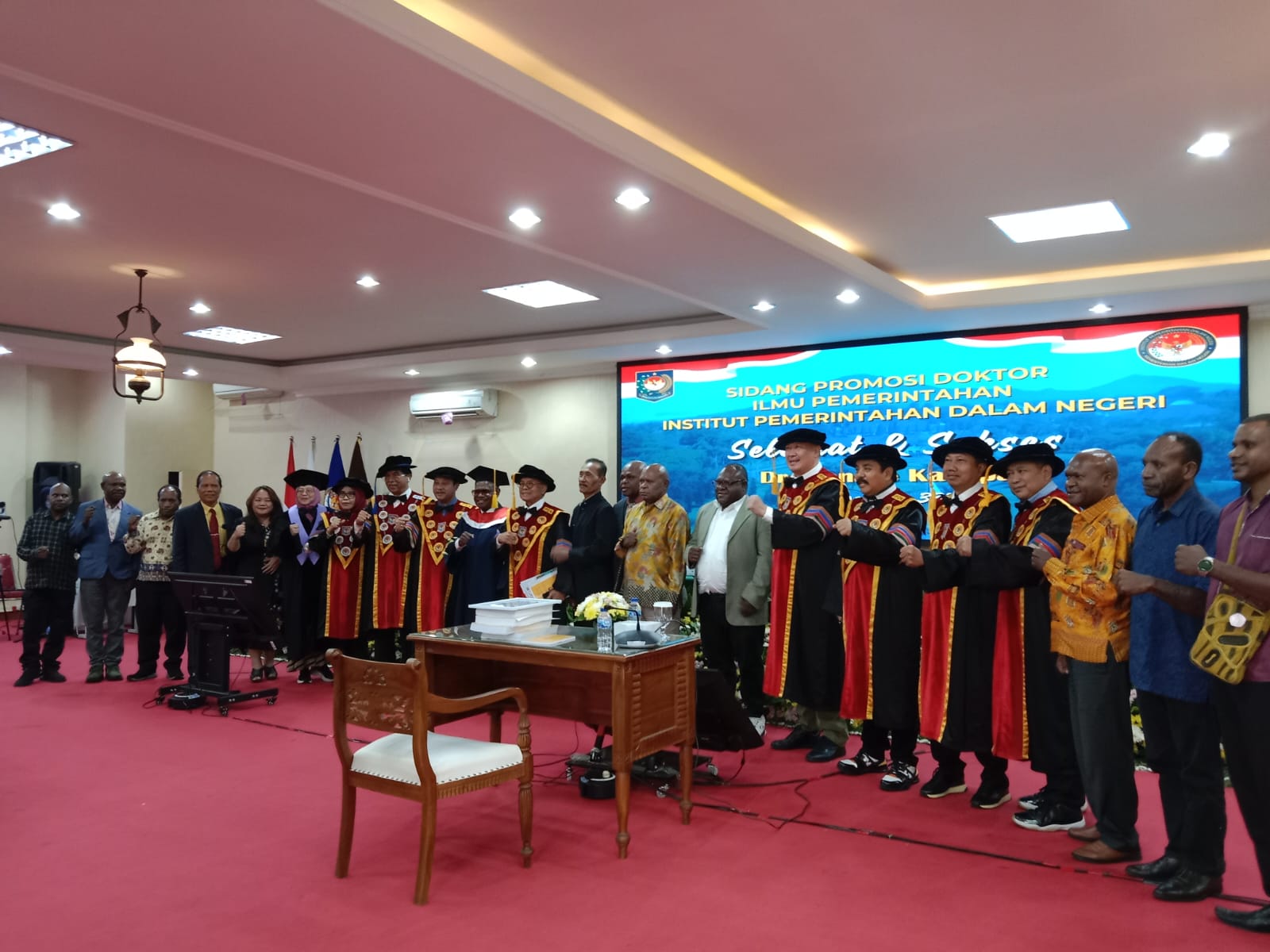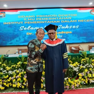 Jakarta, aspirasipublik.com – Selasa, 17 Juni 2025 berlangsung dari pukul 08.30 dan selesai pukul 11.30 di Ruang sidang khusus untuk program pasca sarjana Doktoral IPDN Jakarta di lantai satu gedung pasca sarjana Institut Pemerintahan Dalam Negeri Jakarta, Prof. Dr. H. Wirman Syafri, M.Si. Sekertaris Senat IPDN, Memimpin jalannya sidang Terbuka mewakili atas nama Rektor IPDN Bapak Dr. Halilul Khairi, S.Sos., M.Si., Berikut dari hasil sidang terbuka maka siang ini diputuskan hasil sidang promosi Doktor bahwasanya atas nama Dr. Menase Kadepa,SE., M.Si. Asisten I Bidang Pemerintahan dan Kesejahteraan Rakyat Sekretariat Daerah Provinsi Papua Tengah, Raih Gelar Doktor Ilmu Pemerintahan IPDN KEMENDAGRI ke 335 dengan Predikat Sangat Memuaskan, dengan judul Disertasi
