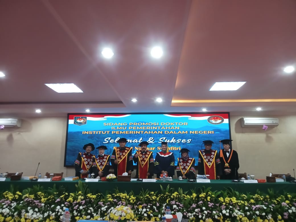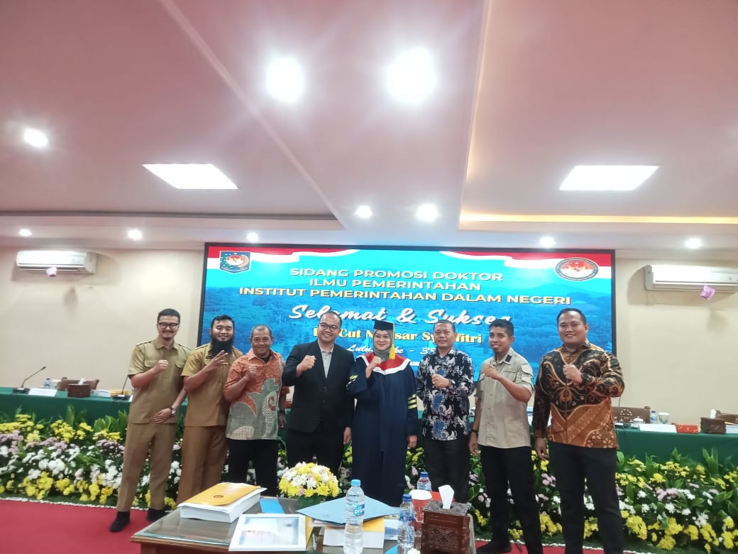 Jakarta, aspirasipublik.com – Selasa, 24 Juni 2025 berlangsung dari pukul 08.30 dan selesai pukul 11.30 di Ruang sidang khusus untuk program pasca sarjana Doktoral IPDN Jakarta di lantai satu gedung pasca sarjana Institut Pemerintahan Dalam Negeri Jakarta, Prof. Dr. Mansyur Achmad, M.Si., Memimpin jalannya sidang Terbuka mewakili atas nama Rektor IPDN Bapak Dr. Halilul Khairi, S.Sos., M.Si., Berikut dari hasil sidang terbuka maka siang ini diputuskan hasil sidang promosi Doktor bahwasanya atas nama Dr. Cut Novisar Syahfitri, S.IP.,M.Si. Analis Data dan Informasi pada Institut Pemerintahan Dalam Negeri, Raih Gelar Doktor Ilmu Pemerintahan IPDN KEMENDAGRI ke 338 dengan Predikat Sangat Memuaskan, dengan judul Disertasi “Evaluasi Kebijakan Penyelenggaraan Perlindungan Penyandang Disabilitas di Provinsi Jawa Barat (Studi Pemenuhan Hak Pekerjaan Sektor Formal Bagi Penyandang Disabilitas di Kota Bandung dan Kabupaten Bandung Barat)” Dengan Tim Promotor terdiri atas, 1. Prof. Dr. Muh. Ilham, M.Si., 2. Dr. Deti Mulyati, SH., MH., CN., 3. Dr. Drs. M. B. Zubakhrum Tjenreng, M.Si. dan Penguji serta Penelaah yang terdiri atas: 1. Prof. Dr. Mansyur Achmad, M.Si., mewakili atas nama Rektor IPDN Bapak Dr. Halilul Khairi, S.Sos., M.Si., memimpin langsung jalannya sidang., 2. Prof. Dr. Drs. Kusworo, M.Si., 3. Dr. Tjahjo Suprajogo, M.Si., 4.Dr. Ella L. Wargadinata, MA., M.Si., 5. Dr. Ir. Deden Gandana, M.Si. (Eksternal)