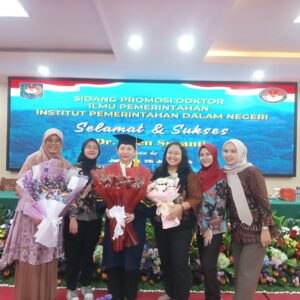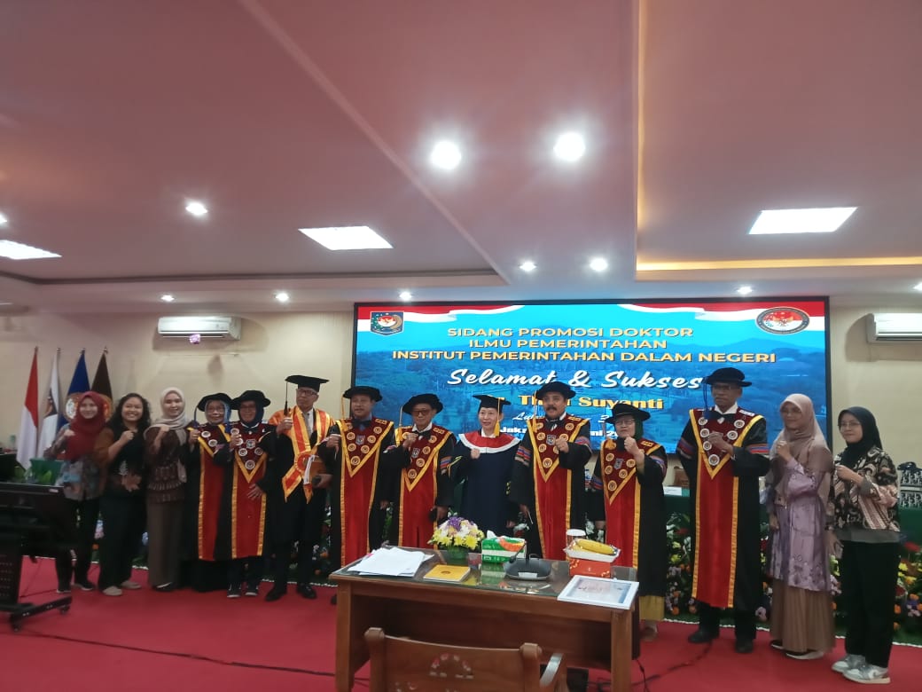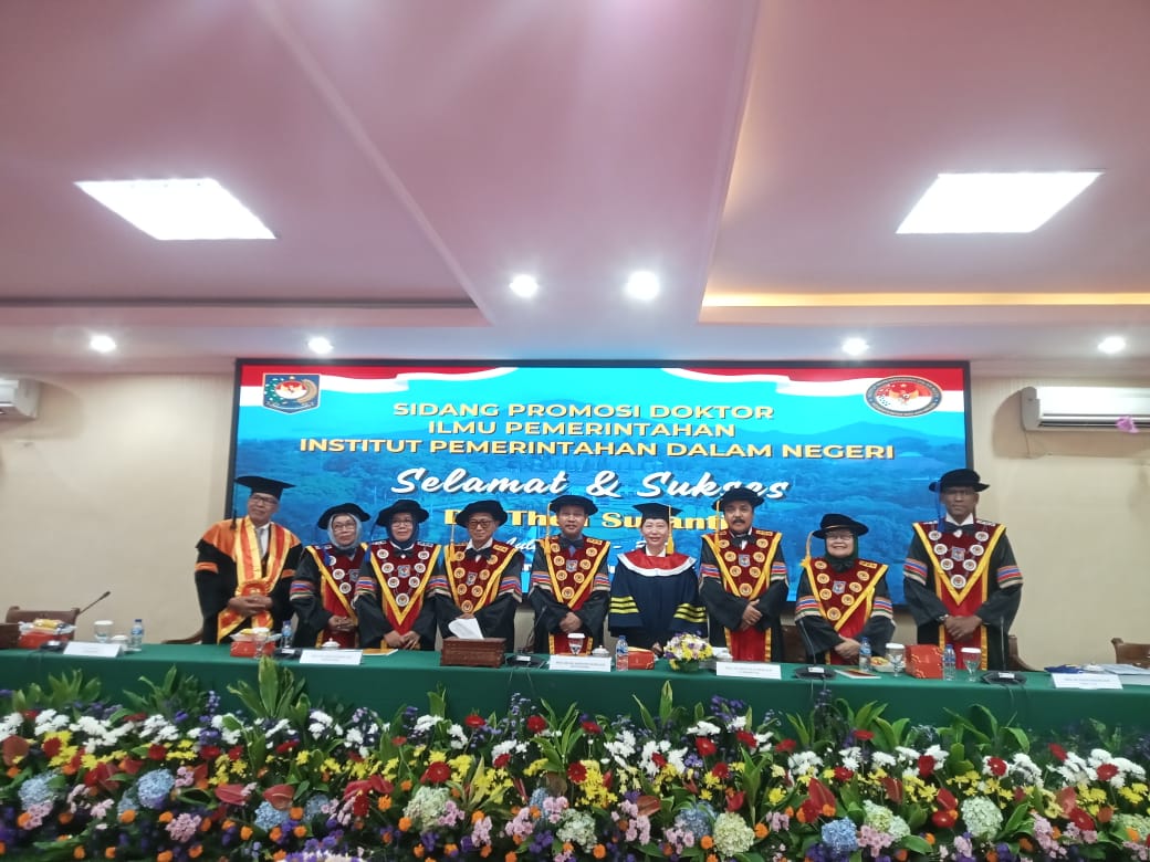 Dengan Tim Promotor terdiri atas, 1. Prof. Dr. Ir. Dedeh Maryani, MM., 2. Prof. Dr. Mansyur Achmad M.Si., 3. Dr. Petrus Polyando, S.STP., M.Si., dan Penguji serta Penelaah yang terdiri atas: 1. Prof. Dr. H. Wirman Syafri, M.Si. mewakili atas nama Rektor IPDN Bapak Dr. Halilul Khairi, S.Sos., M.Si., memimpin langsung jalannya sidang., 2. Prof. Dr. Muh. Ilham, M.Si., 3. Prof. Dr. Dahyar Daraba, M.Si., 4. Dr. Ika Sartika, MT., 5. Dr. Ir. Etin Indrayani, MT., 6. Dr. Muhammad Sawir, S.Sos., M.Si., M.H (Eksternal)