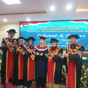 Jakarta, aspirasipublik.com – Rabu, 25 Juni 2025 berlangsung dari pukul 13.30 dan selesai pukul 15.30 di Ruang sidang khusus untuk program pasca sarjana Doktoral IPDN Jakarta di lantai satu gedung pasca sarjana Institut Pemerintahan Dalam Negeri Jakarta, Prof. Dr. Drs. Hyronimus Rowa, M.Si .Wakil Rektor Bidang Akademik Dan Inovasi, Memimpin jalannya sidang Terbuka mewakili atas nama Rektor IPDN Bapak Dr. Halilul Khairi, S.Sos., M.Si., Berikut dari hasil sidang terbuka maka sore ini diputuskan hasil sidang promosi Doktor bahwasanya atas nama Dr. dr. Then Suyanti, MM. Direktur Kesehatan Lingkungan Kementerian Kesehatan,Raih Gelar Doktor Ilmu Pemerintahan IPDN KEMENDAGRI ke 340 dengan Predikat Sangat Memuaskan, dengan judul Disertasi