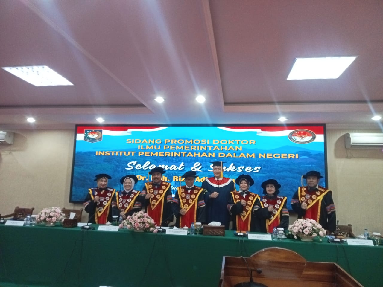 Dengan Tim Promotor yang terdiri dari :1. Prof. Dr. Nurliah Nurdin, MA., 2. Prof. Dr. Muhadam Labolo, M.Si., 3. Dr. Rosmery Elsye, SH, M.Si. Tim penelaah/penguji yang terdiri atas:1. Dr. Halilul Khairi, M.Si. Rektor IPDN yang diwakili Bapak Prof. Dr. Muhadam Labolo, M.Si., selaku pimpinan sidang., 2. Prof. Dr. Mansyur Achmad, M.Si., 3. Dr. Tjahjo Suprajogo, M.Si., 4. Dr. Faria Ruhana, M.P., 5. Dr. Dra. Gatiningsih, MT., 6. Prof. Dr. Mohammad Mulyadi, AP., M.Si.(Penguji Eksternal).