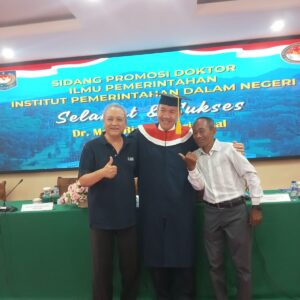 Setelah mempertahankan Disertasinya dihadapan promotor dan penguji selama tiga jam akhirnya Berhak dan dapat Meraih gelar Doktor Ilmu Pemerintahan ke 352 dengan predikat sangat Memuaskan dengan judul Disertasi “Implementasi Kebijakan E-Government Melalui Sistem Informasi Citizen Relation Management (CRM) dalam Mendukung Tata Kelola Pemerintahan di Provinsi Daerah Khusus Jakarta”
